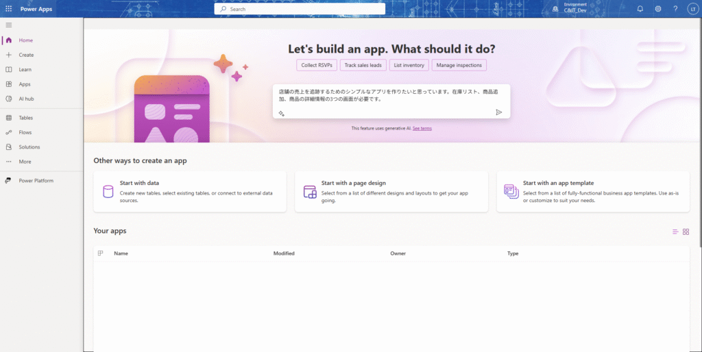 Power Appsのホームページに統合されたCopilotの入力ボックスに要求を記入する。