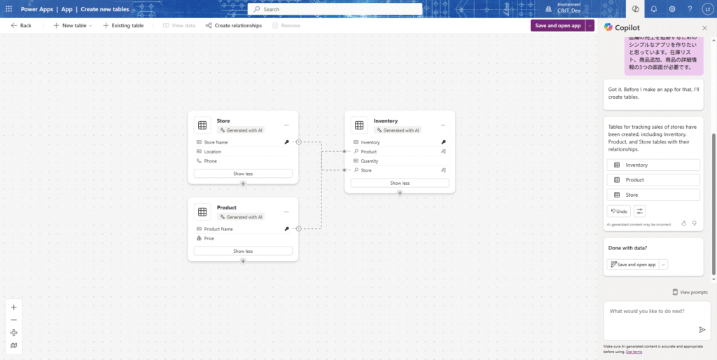 - 自動生成: 自然言語での指示から、Dataverseテーブルやアプリの自動生成に加え、ワークフローの自動化も可能なので、ゼロから開発する手間が省ける