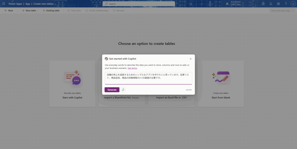 ・CopilotのAI機能を使用するため、Power Appsの有料ライセンス(PremiumまたはPer App)が必要。