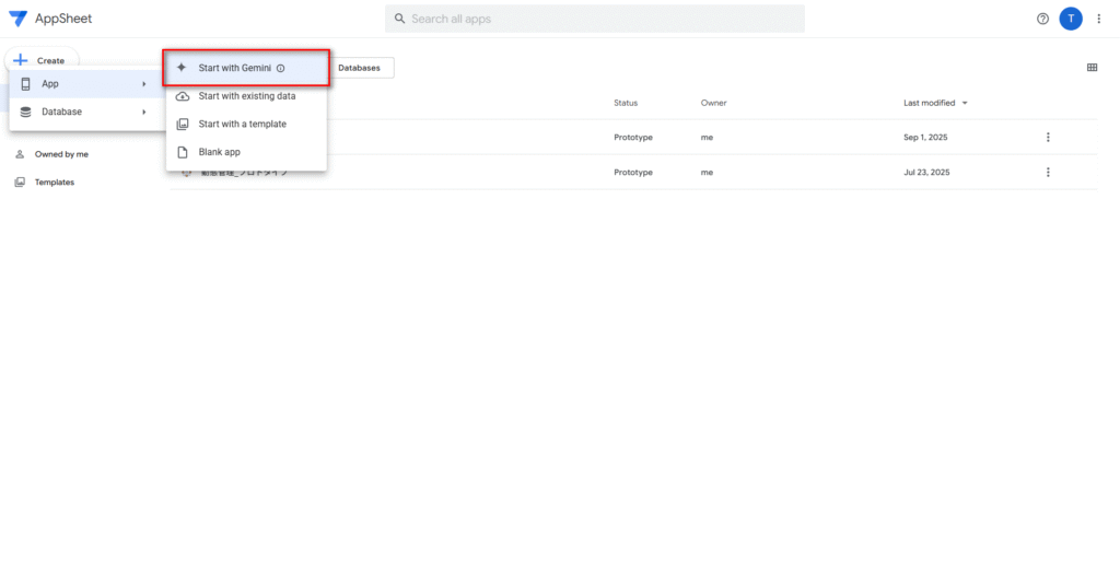 AppSheetのホームページに「Create」/「作成」をクリックし、「App」/「アプリ」を選択、そして「Start with Gemini」/「Geminiで始める」を選択する。
