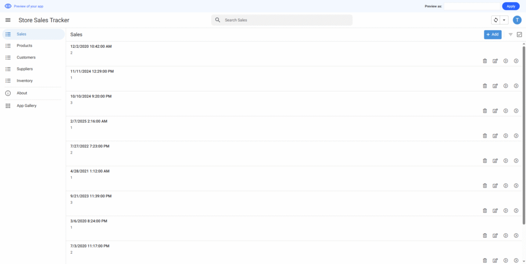 ※デフォルトでは、販売一覧画面はアプリ作成時にホーム画面として設定された。(この設定は変更可能。)