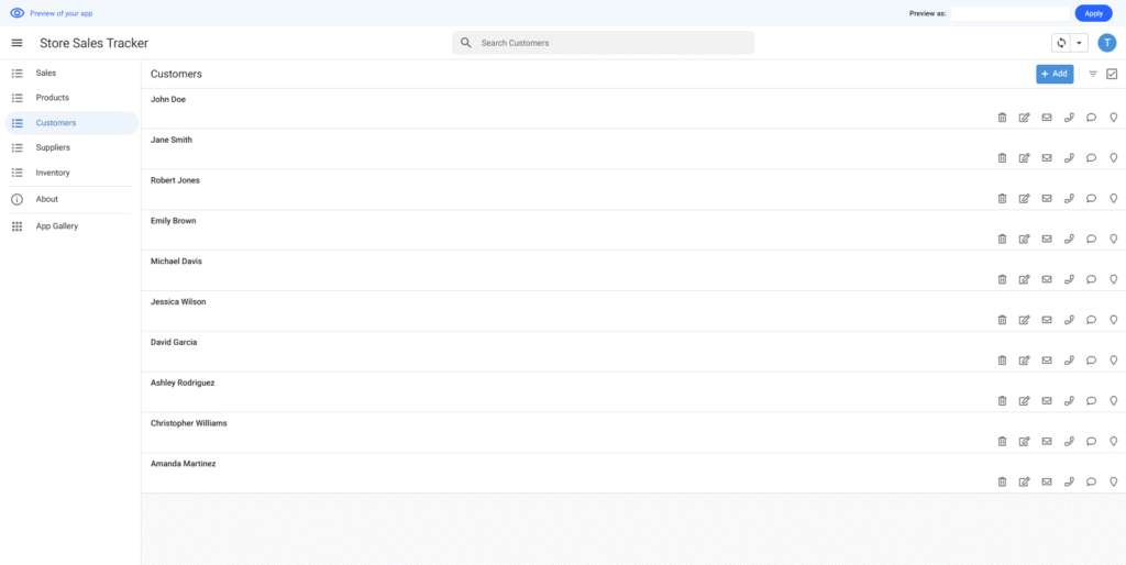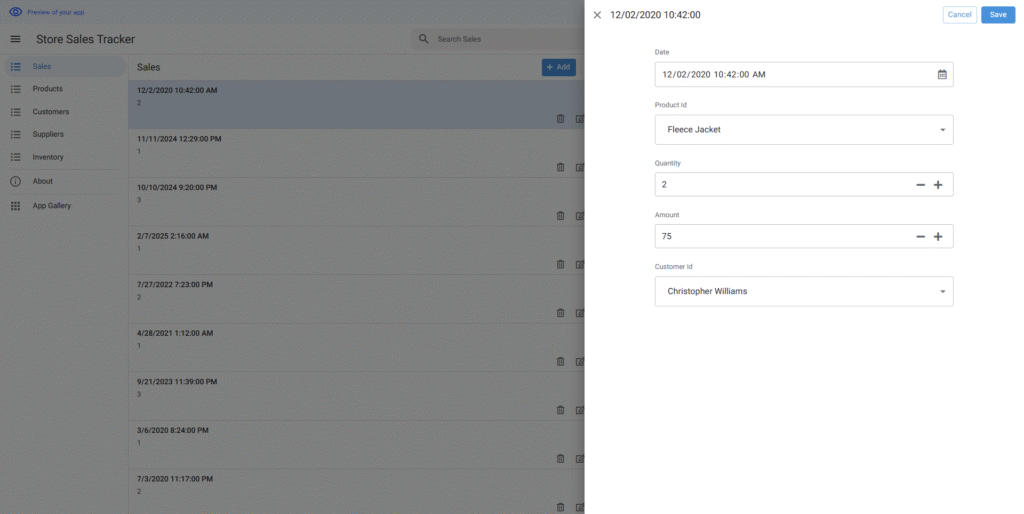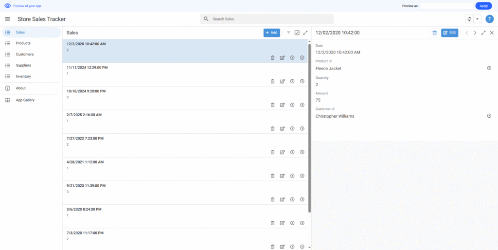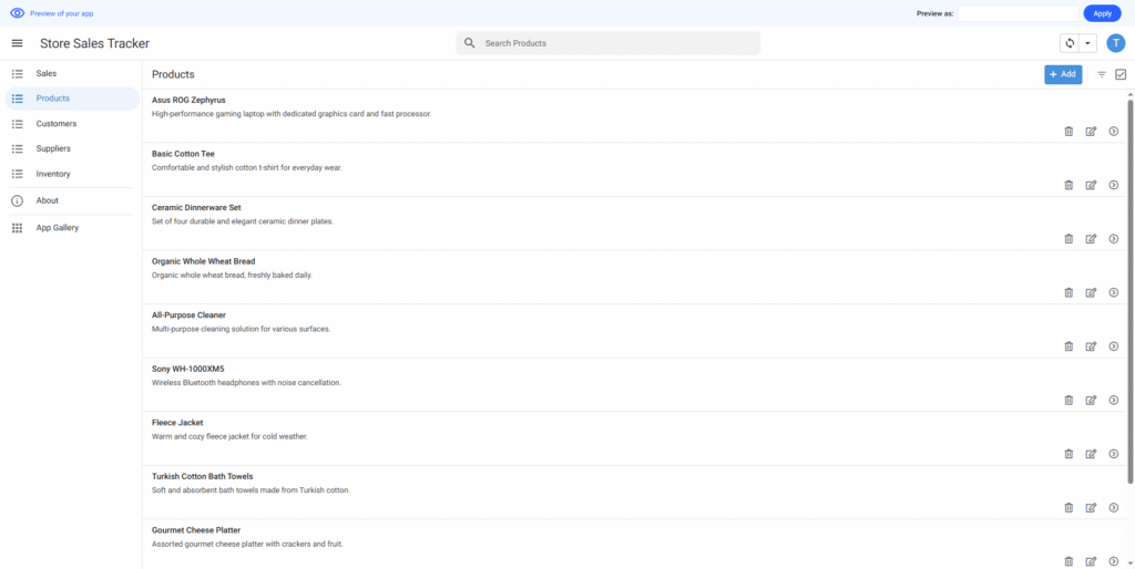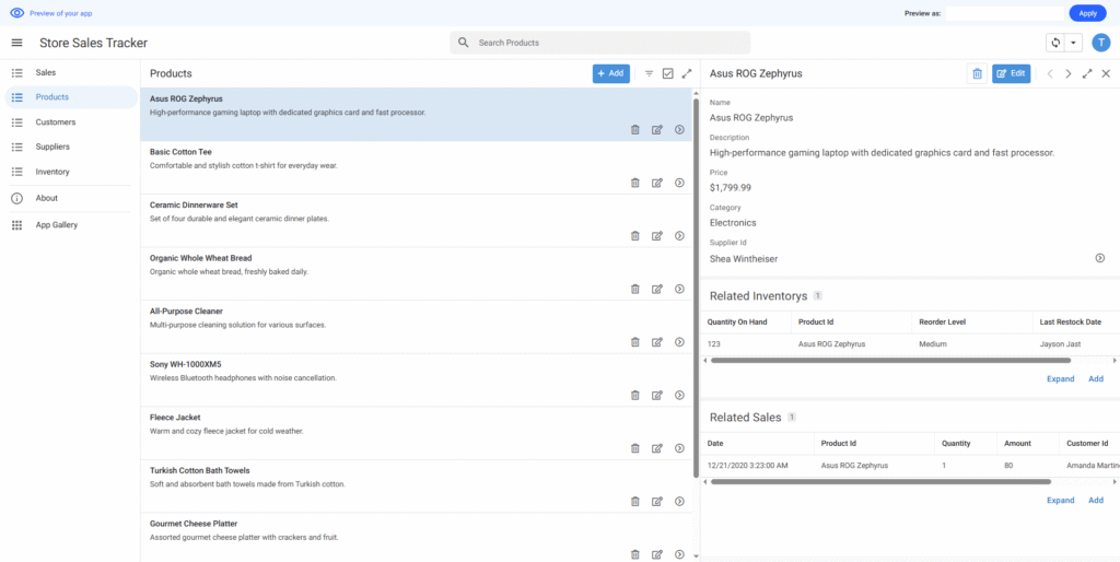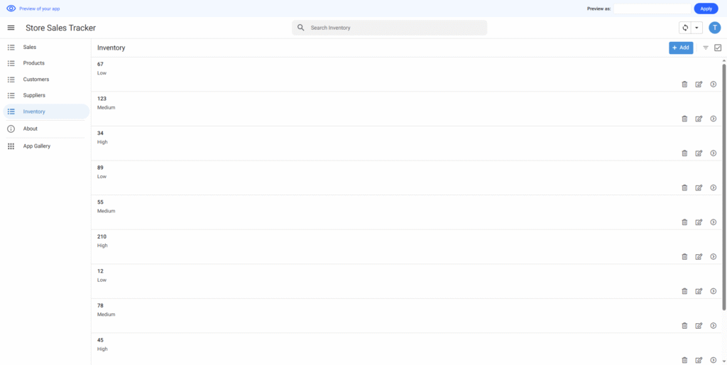 店舗の売上を追跡するためのシンプルなアプリを作りたいと思っています。在庫リスト、商品追加、商品の詳細情報の3つの画面が必要です。