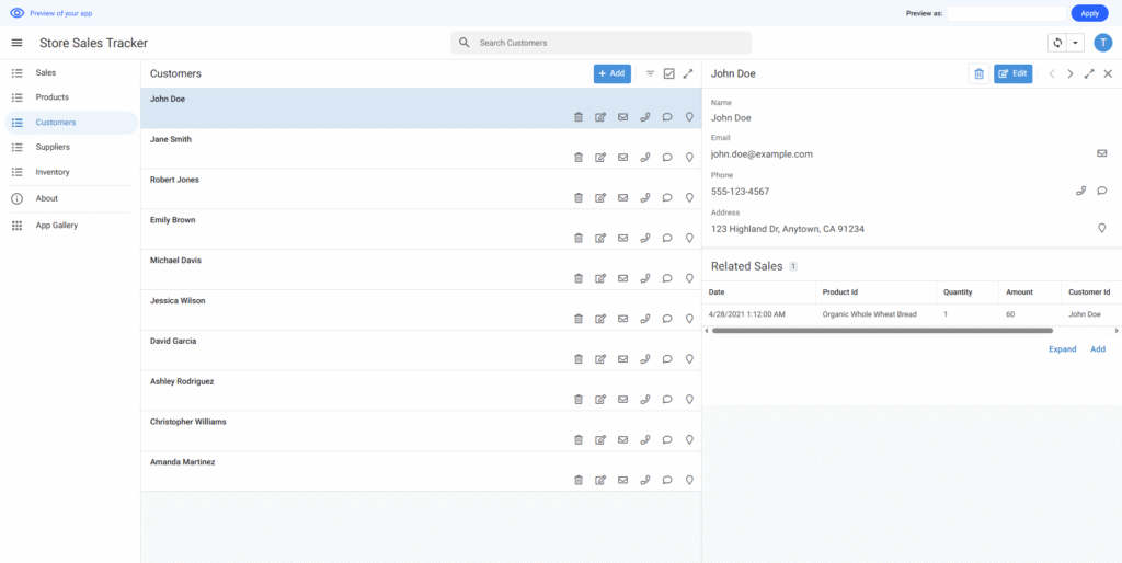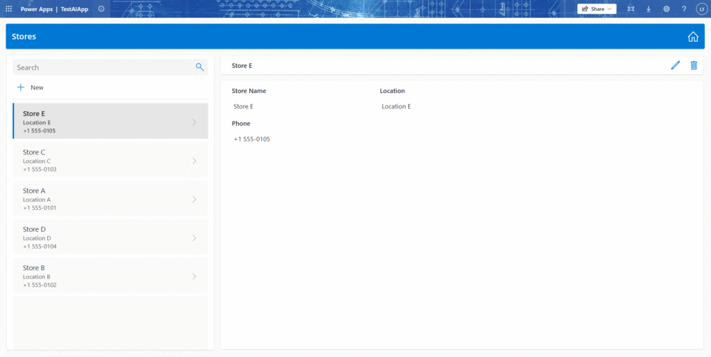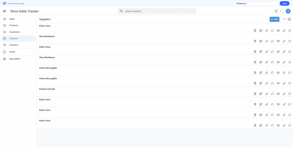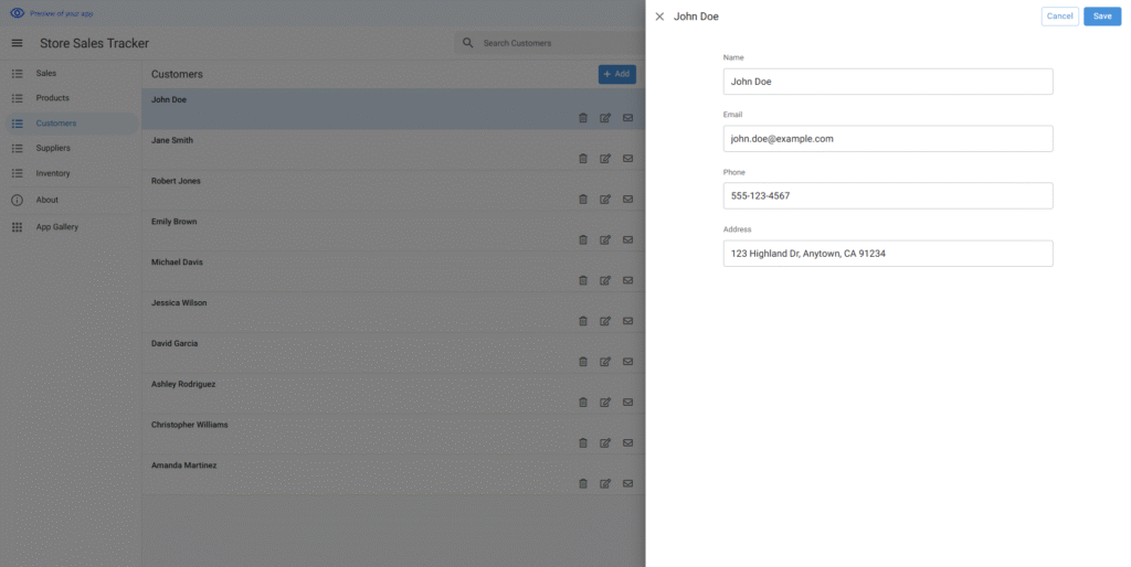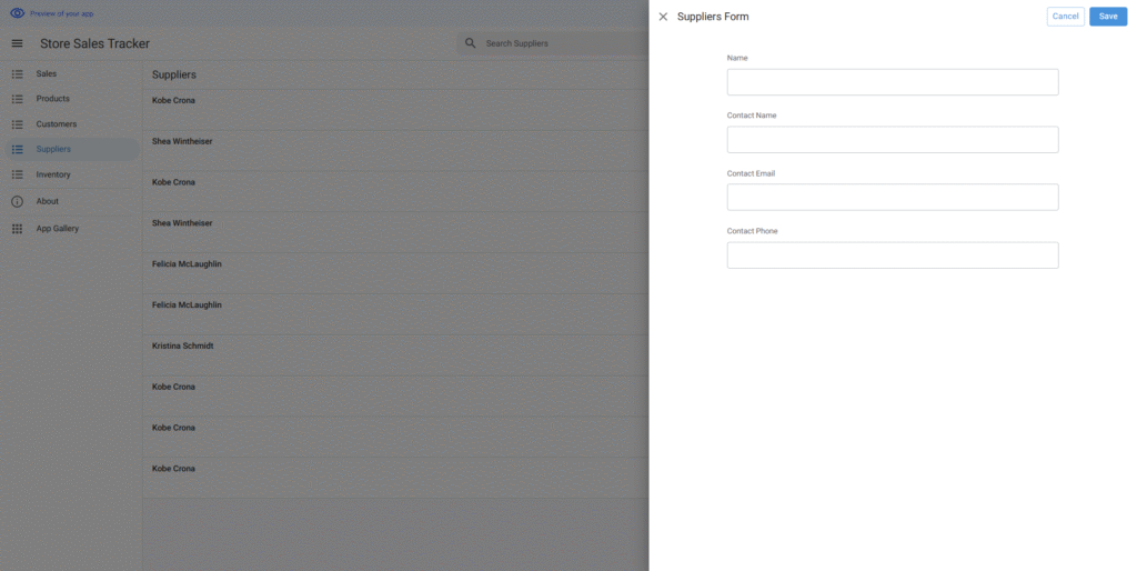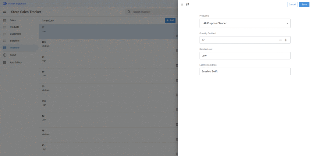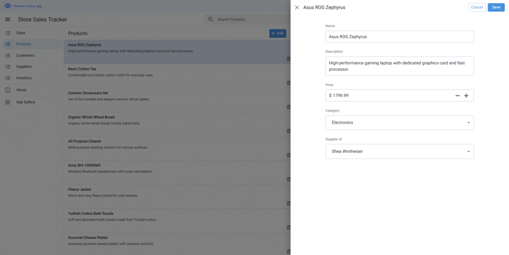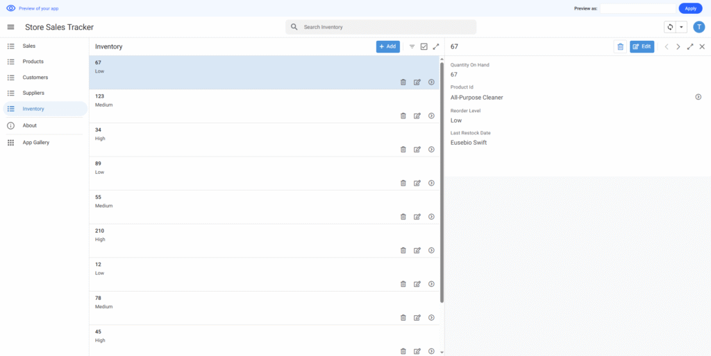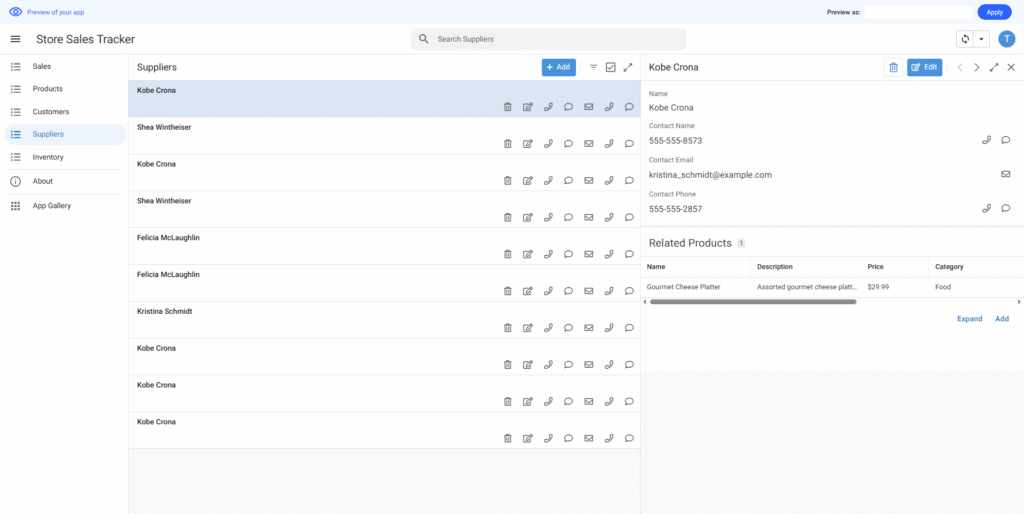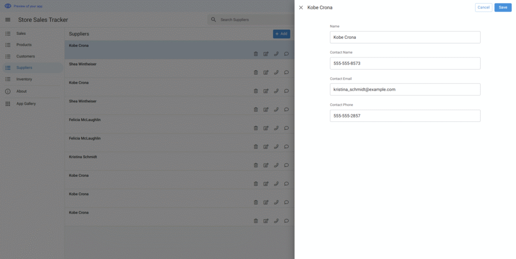 作成されたアプリはエディタ画面で要望より調整できる。サンプルデータもニーズに合わせて変更できる。