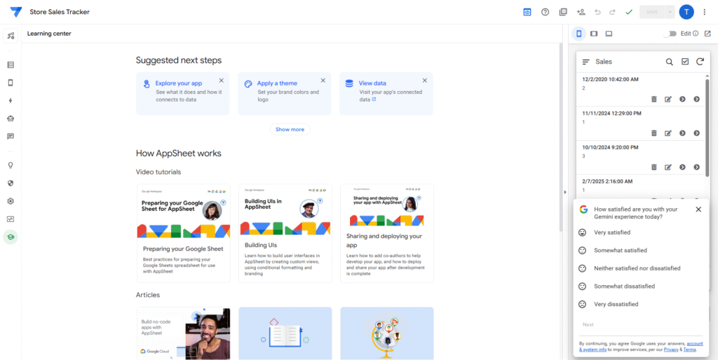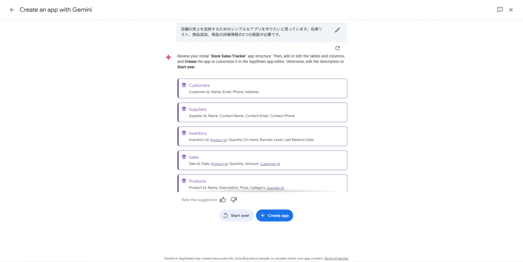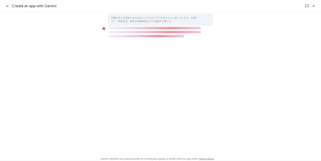 - Gemini in AppSheet: チャット形式での対話を通じて、アプリの設計や機能のアイデア出し、データ構造の検討をサポートすると、自然言語で作りたいアプリのイメージを伝えるだけで、アプリのたたき台を自動生成できる