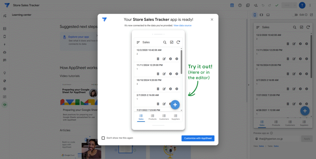 ※ AppSheetはデータ駆動型プラットフォームなので、アプリを作成するとき、サンプルデータも自動的に作成される。