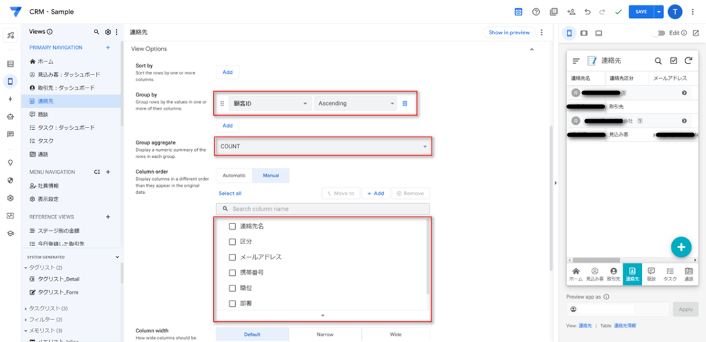 例えば、「連絡先」の連絡先一覧画面には、「顧客ID」でグループし、グループのカウントも設定した場合は、
