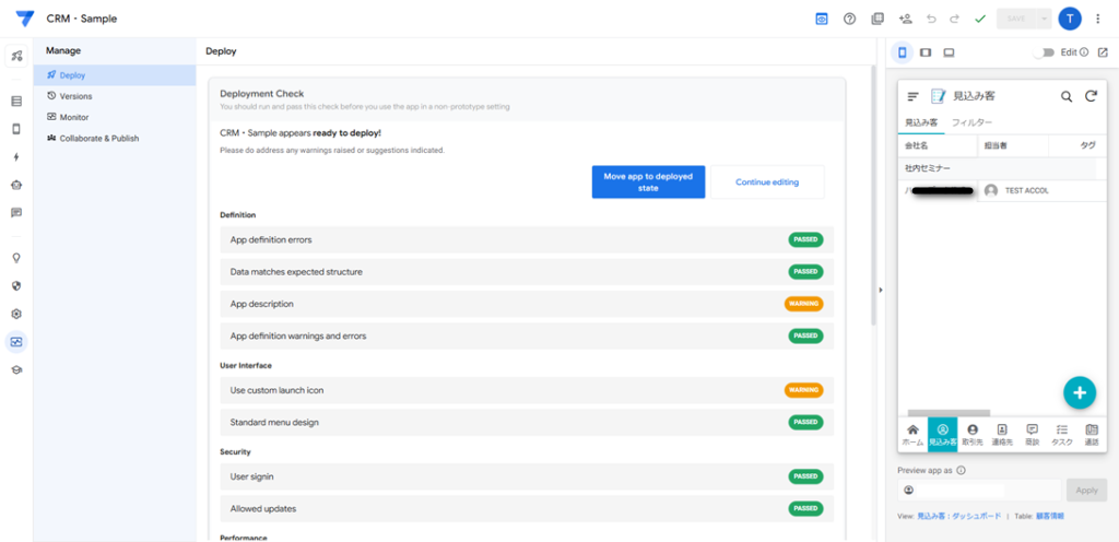 ※アプリロゴやアプリ説明などカスタマイズ関係の問題があるなら、警告メッセージが表示される - 不具合がなくすぐにデプロイできるなら、デプロイするためのボタンが表示される