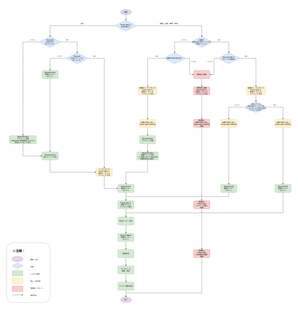 利用対象やMicrosoftサービスの利用状況、ニーズによってPower Platformの申請手順が異なるので、Power Appsを例に、以下の流れをご参照ください。(画像をクリックすると、PDF版をダウンロード(または表示)できます。)
