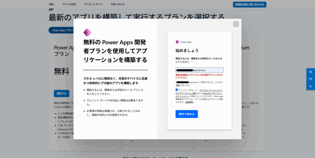 また、Microsoftサービスとテナント連携していない組織のメールアカウントで登録しようとすると、無料プランでもエラーメッセージが表示される。