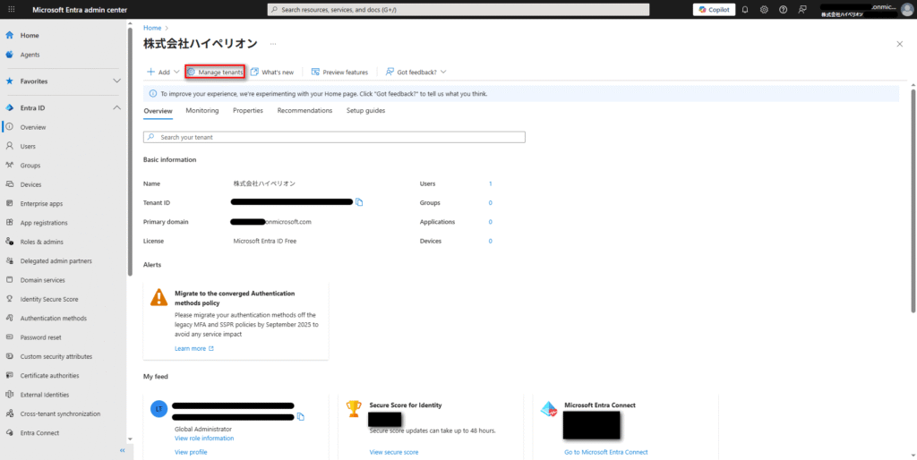 3.Overview画面で、「Manage tenants」/「テナント管理」を選択する