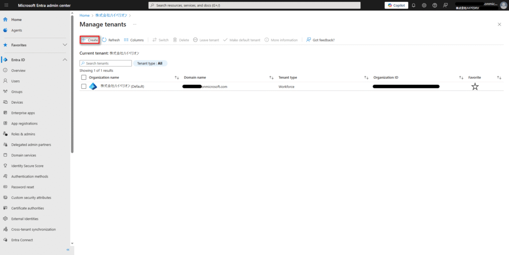 4.テナント一覧画面で、「Create」/「作成」を選択する