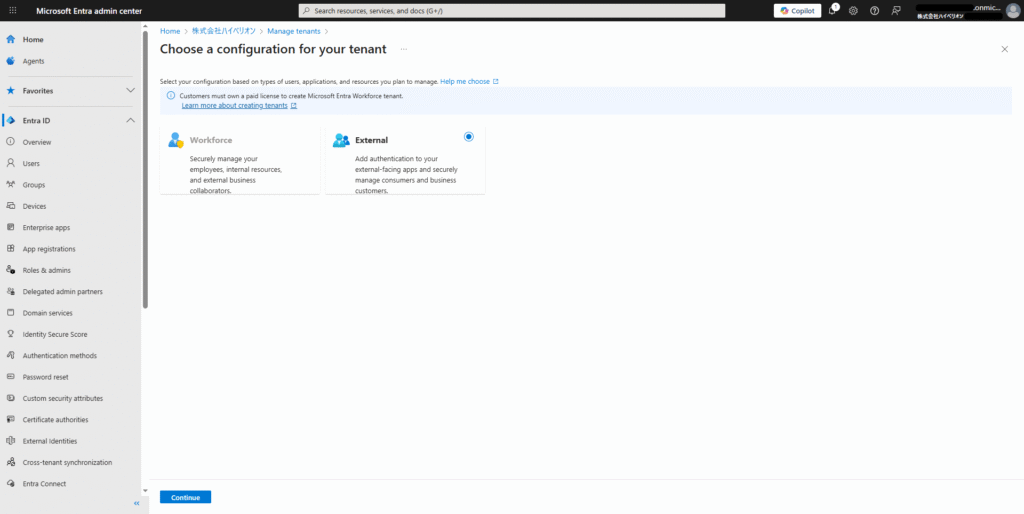5.テナントタイプを選択し、「Continue」/「続く」を選択する