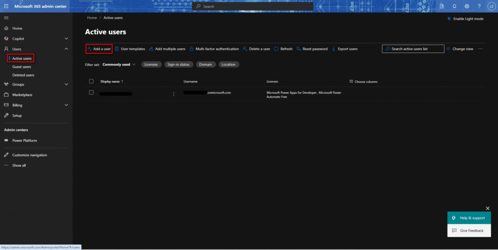 ・または、メインメニューで「Users」/「ユーザー」を選択、「Active users」/「アクティブユーザー」を選択すると、アクティブユーザー一覧画面で、「Add a user」/「ユーザー追加」を選択する