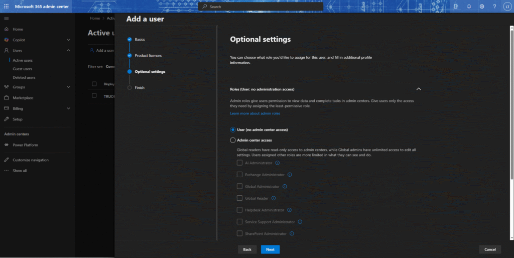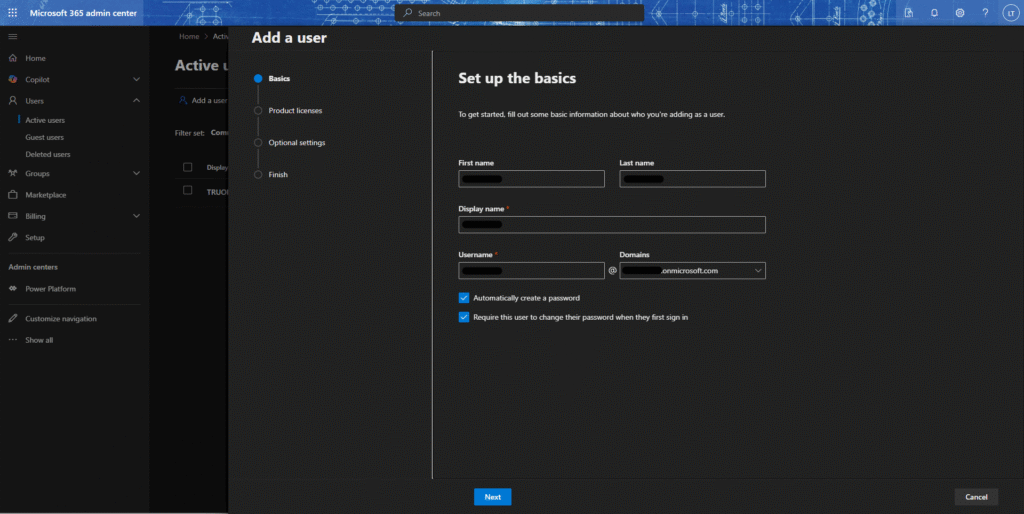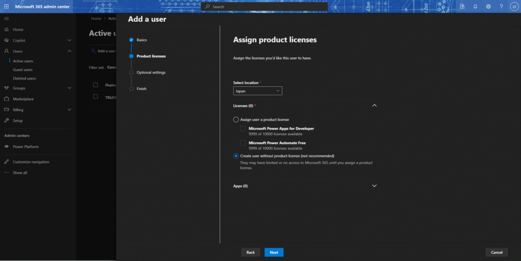 ・アサインする商品ライセンスが未定で、後で設定したい場合は、「Create user without product license」を選択してください