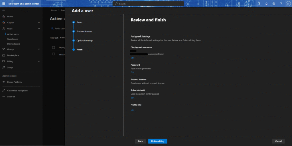 6.情報に問題がないことを確認し、「Finish adding」/「追加完了」を選択するすると、ユーザーがテナントに追加される