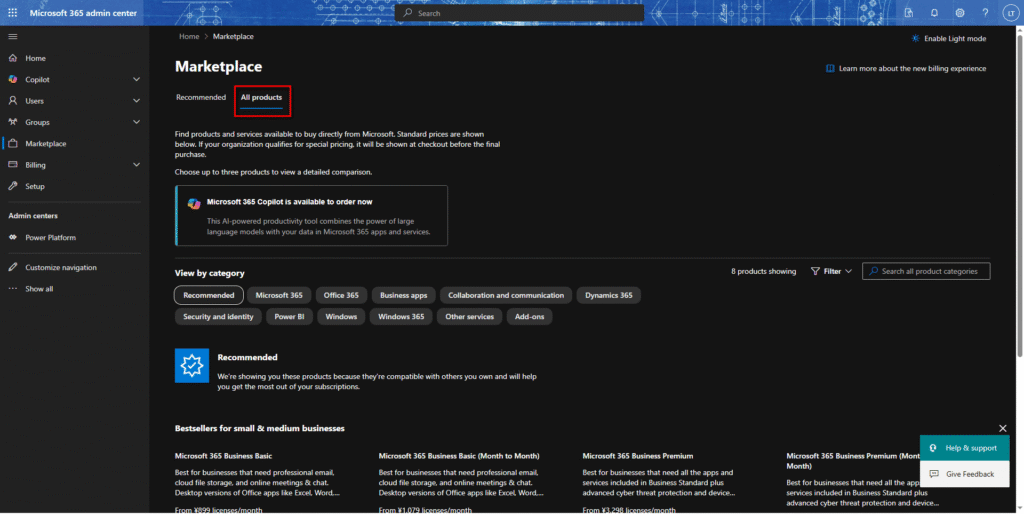 3.マーケットプレイス画面で、「All products」/「すべて商品」タブを選択する