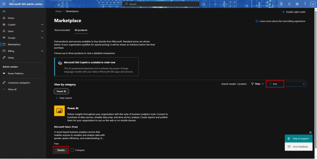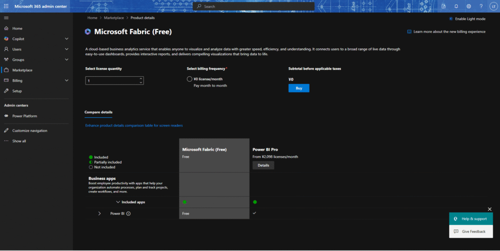 なお、購入するデモ商品はMicrosoft Fabric Free(Power BIの無料バーション)。