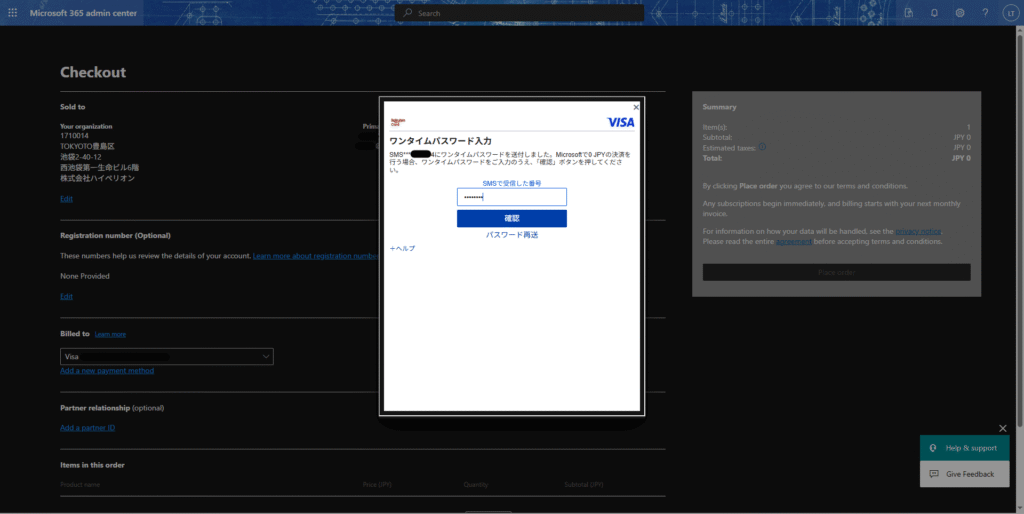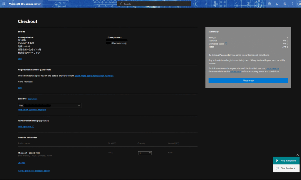 6.チェックアウト画面で、情報を確認、請求方法を指定した後、「Place order」/「注文」を選択する