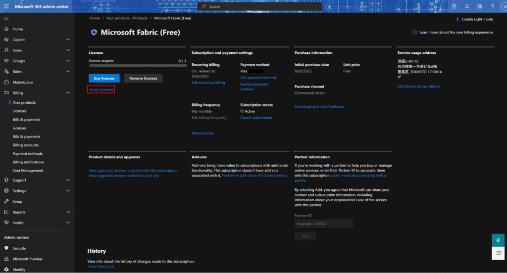 3.商品詳細画面で「Assign licenses」/「ライセンスアサイン」を選択する