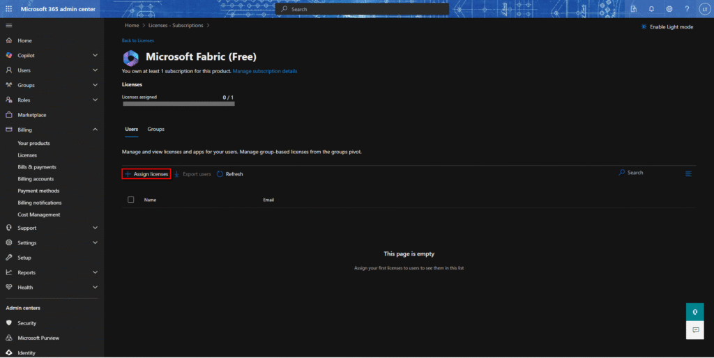 4.ライセンスサブスクリプション画面で、「Assign licenses」/「ライセンスアサイン」を選択する