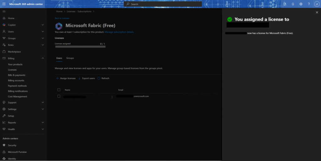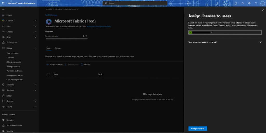 6.「Assign licenses」/「ライセンスアサイン」を選択すると、商品ライセンスがユーザーにアサインされる