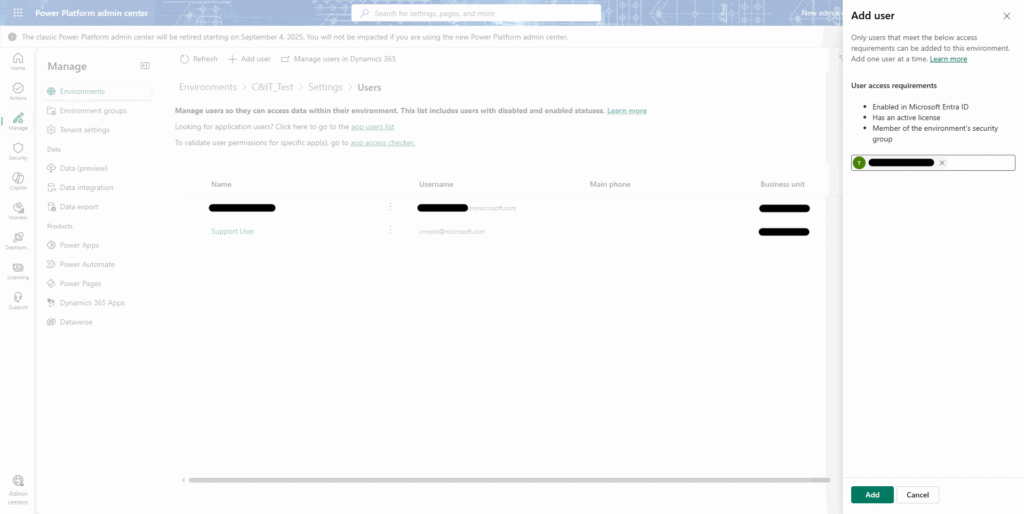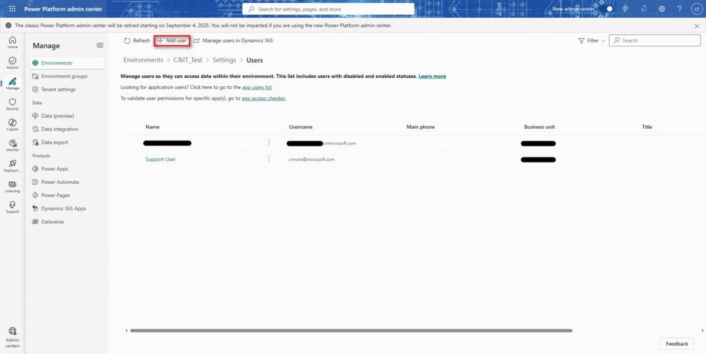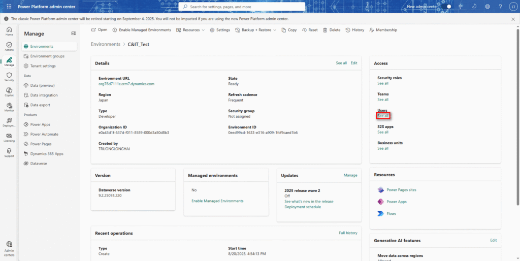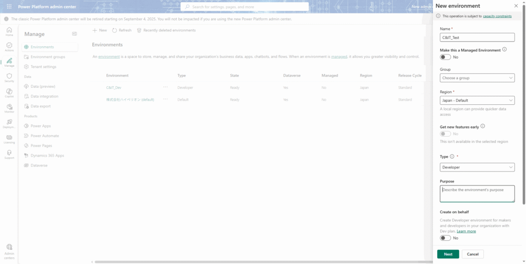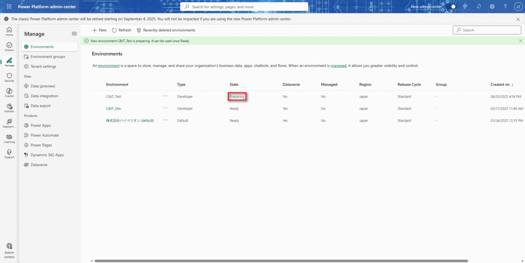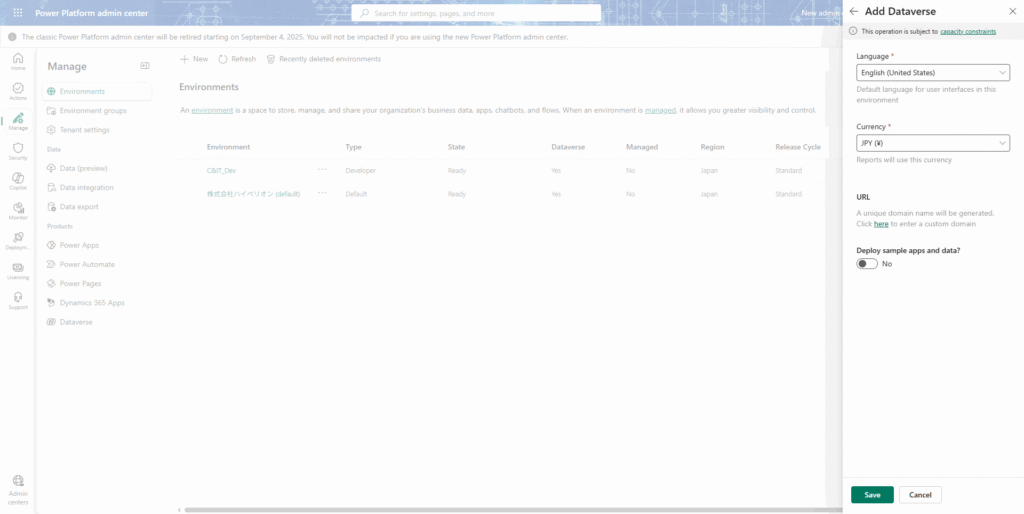 ※デモンストレーションでは、Microsoft Power Platform管理センターの英語版を使用する。