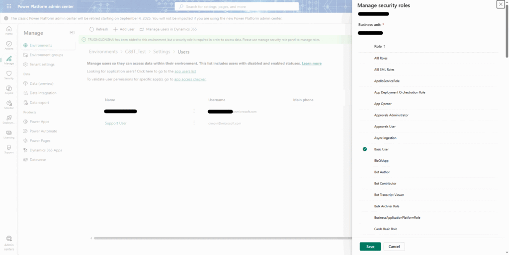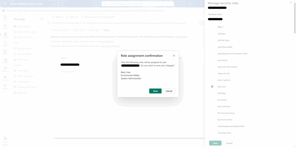 7.ロールアサイン確認ポップアップで情報を確認し、「Save」/「保存」を選択する