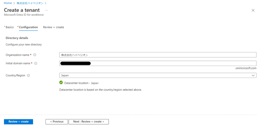 6.テナント設定情報を入力し、「Review + Create」/「レビュー + 作成」を選択した後、次のページに確認しと、「Create」/「作成」を選択するとテナントが作成される